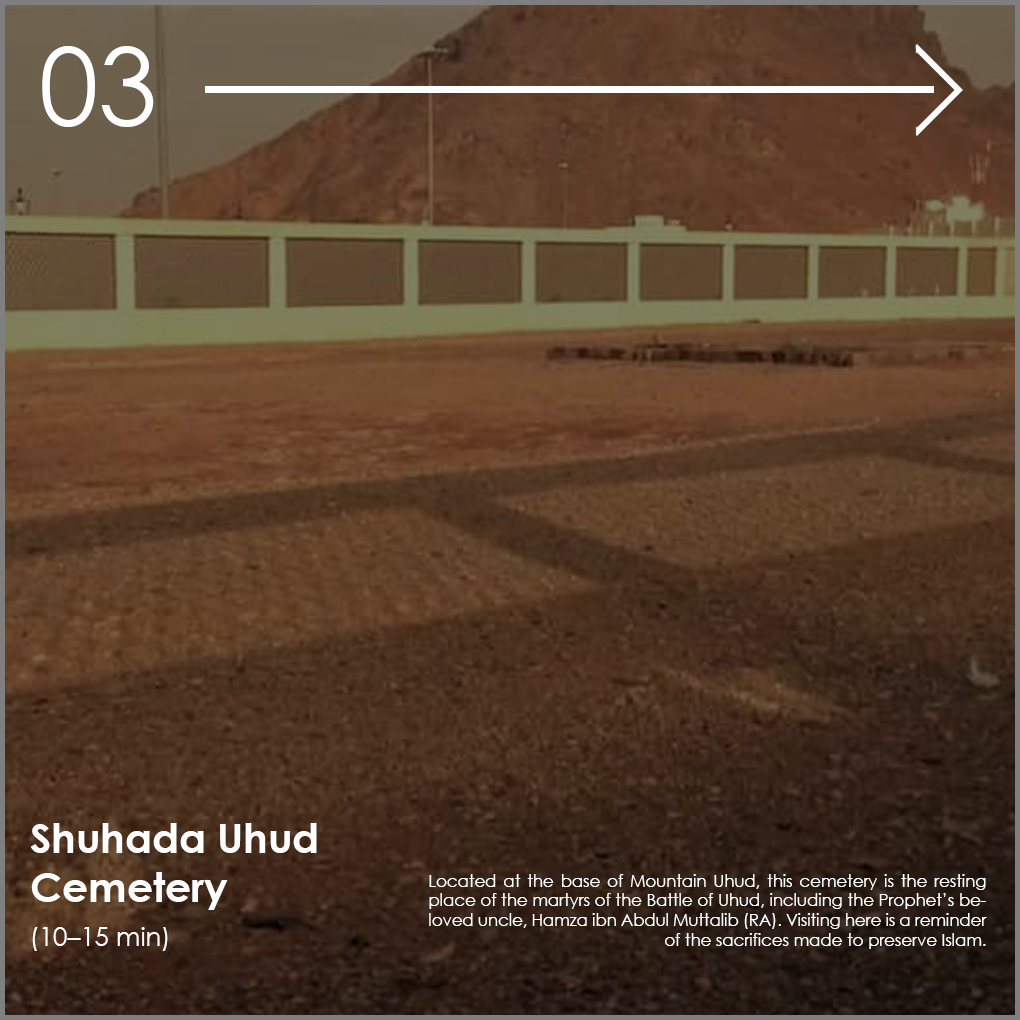 - Shuhada Uhud Cemetery: Pay respects at the resting place of martyrs, including Hamza ibn Abdul Muttalib (RA).