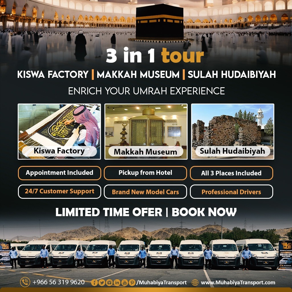 - Entry and guided tour of Kiswa Factory, Makkah Museum, and Sulah Hudaibiyah.